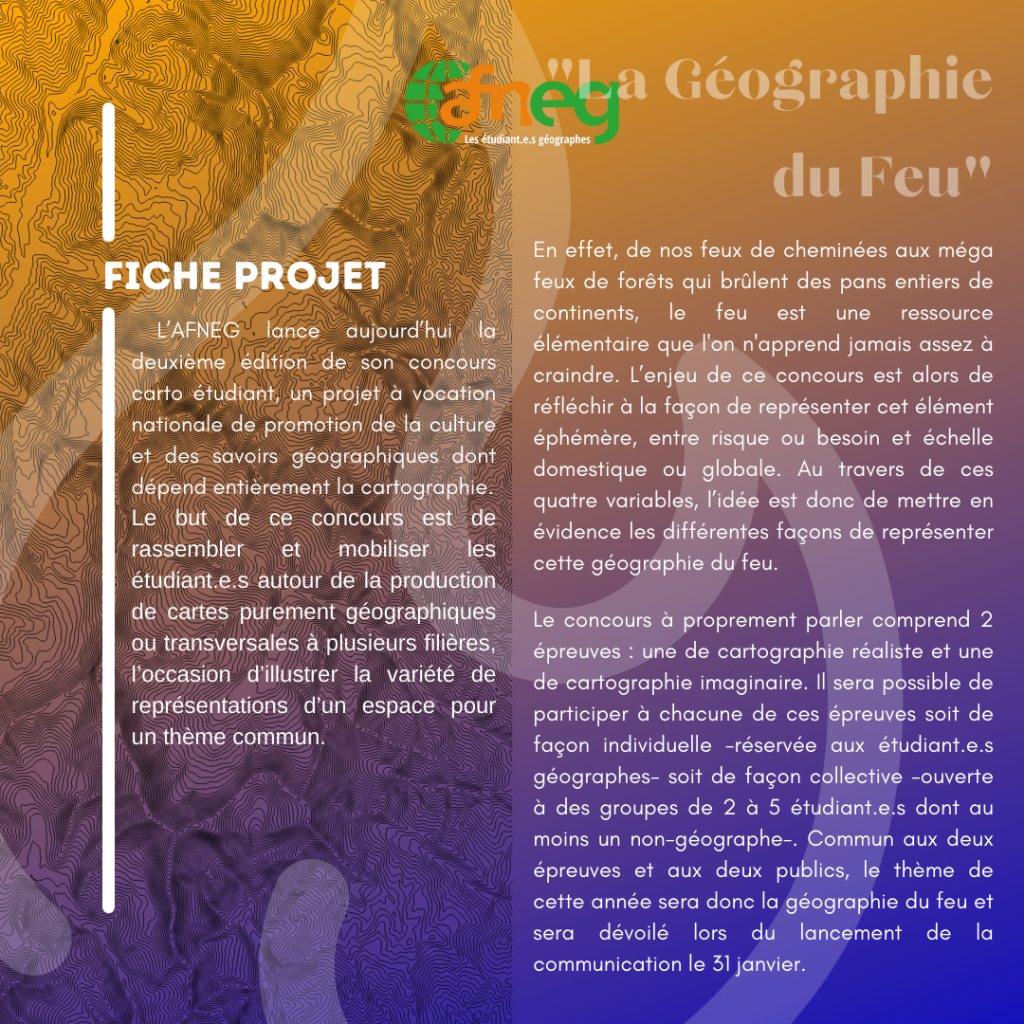 Le but de ce concours est de rassembler et mobiliser les étudiant.e.s autour de la production de cartes géographiques ou transversales à plusieurs filières, l’occasion d’illustrer la variété de représentations d’un sujet : la géographie du feu.