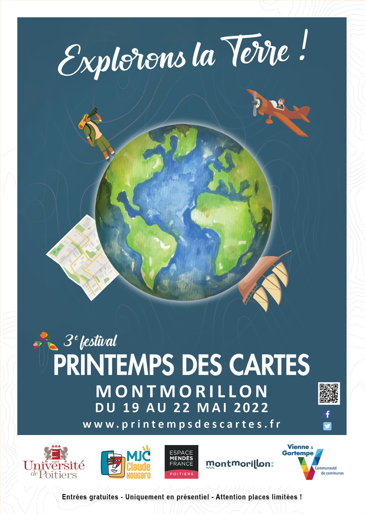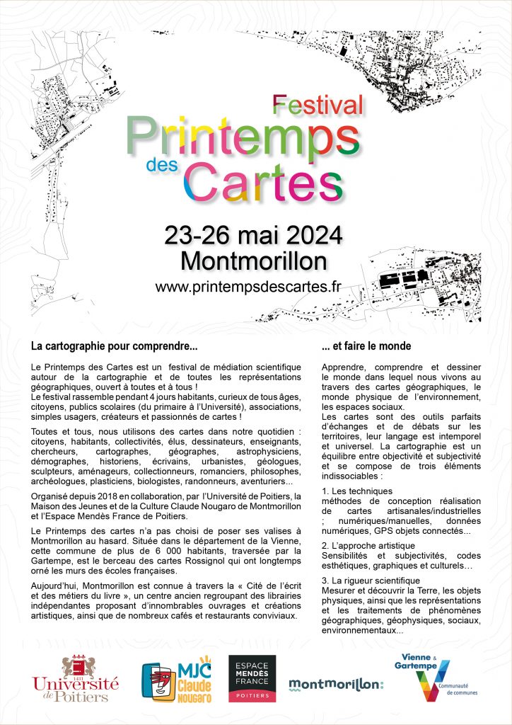 Le Printemps des cartes a été créé en 2018 à Montmorillon dans la Vienne. L’évènement est organisé par un collectif regroupant géographes, cartographes, artistes et passionnés des représentations de l’espace, en collaboration entre l’Université de Poitiers, la MJC Claude Nougaro de Montmorillon et l’Espace Mendès France de Poitiers.